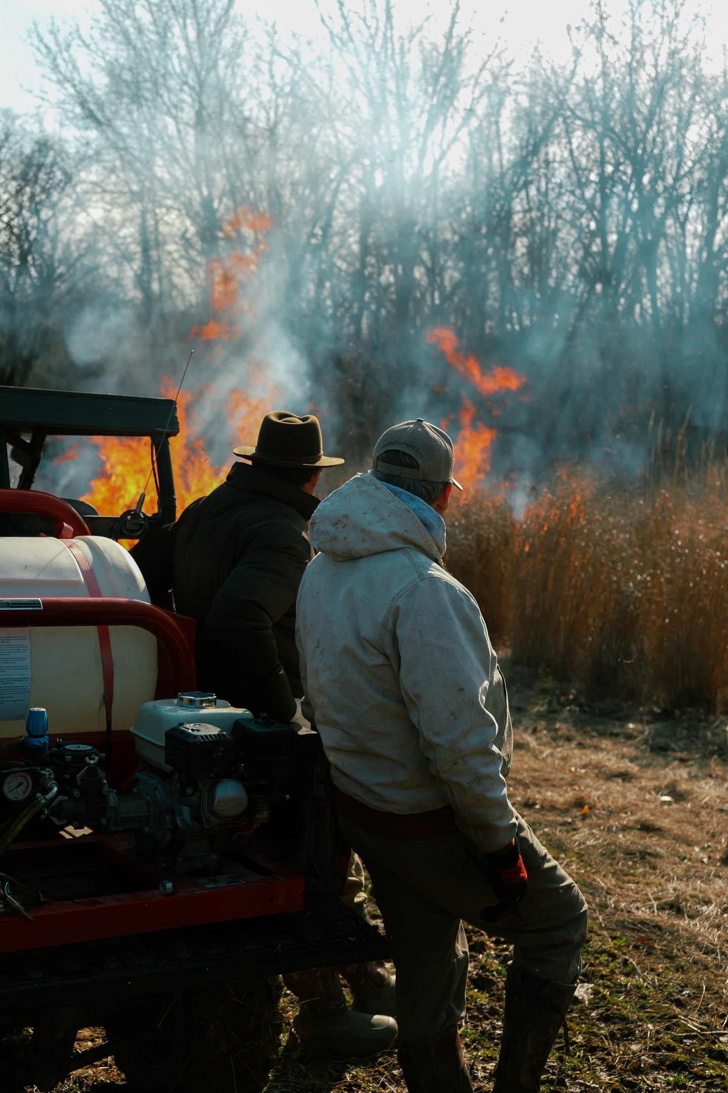 Equipment for a typical burn includes drip torches, backpack pump sprayers (5-gallon), an ATV or truck with a mounted water tank and pump (at least 100 gallons, ideally 200+), a disk or mower for emergency firebreak construction, hand tools (rakes, flappers, shovels), weather kit (Kestrel or similar for temperature, humidity, and wind readings), two-way radios for crew communication, and a first aid kit.