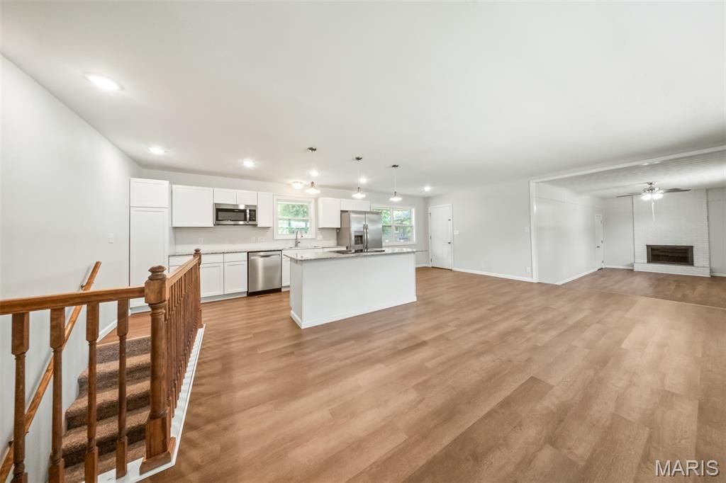Completely remodeled and move-in ready, this stunning 5-bedroom, 3-bath brick home is perfectly situated in the heart of Waynesville-just minutes from shopping, dining, and everyday conveniences! Step inside to a welcoming dining and kitchen area where stylish luxury vinyl plank flooring flows seamlessly throughout the home. The spacious family room is the perfect gathering spot, featuring a cozy wood-burning fireplace for those cooler evenings. The eat-in kitchen is sure to impress with beautiful granite countertops, sleek stainless steel appliances, and ample space for both cooking and entertaining. The main-level primary suite offers comfort and convenience with a private full bathroom featuring a shower. Two additional bedrooms and a full guest bath complete the main floor. Downstairs, you'll find even more living space with a large second family room, two generous bedrooms, a third full bathroom, and a dedicated laundry room-ideal for guests, extended family, or extra flexibility. With modern updates throughout, a desirable layout, and a prime location close to amenities, this home truly has it all!