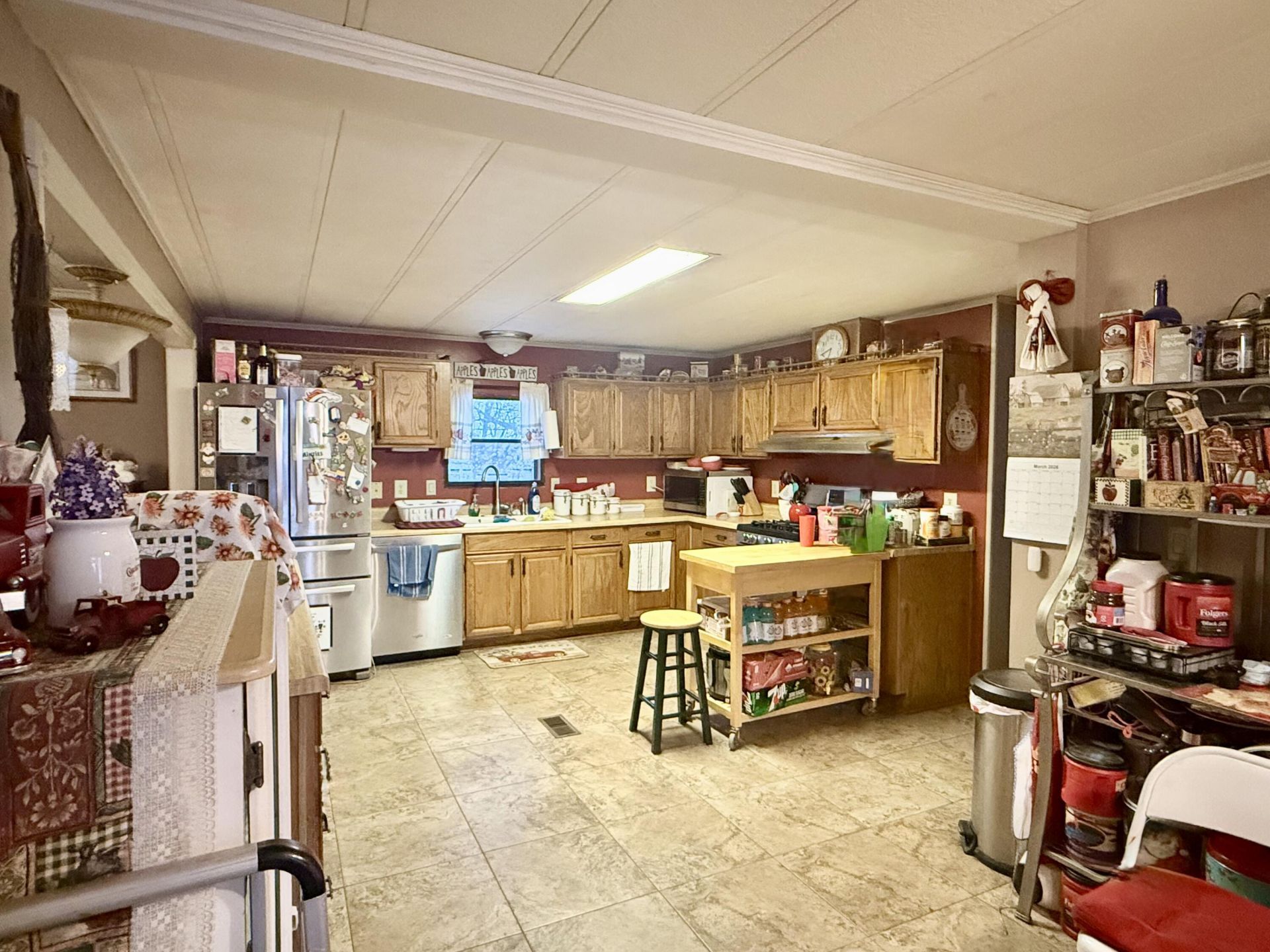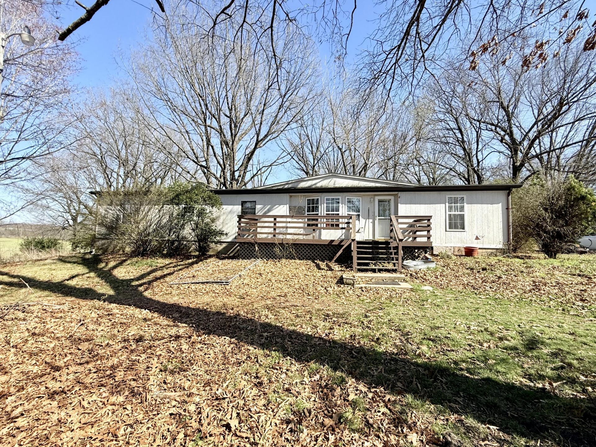 3 Bedroom, 2 Bathroom Residence Spanning 1785 sq ft on 1.38 Acres 10240 Lawrence 1000, La Russell, MO 64848. Discover serene country living on 1.38 acres with a spacious manufactured home featuring The open layout of a spacious living room, kitchen with dining area and bar, and two decks ideal for relaxation, surrounded by peaceful surroundings and picturesque country views.