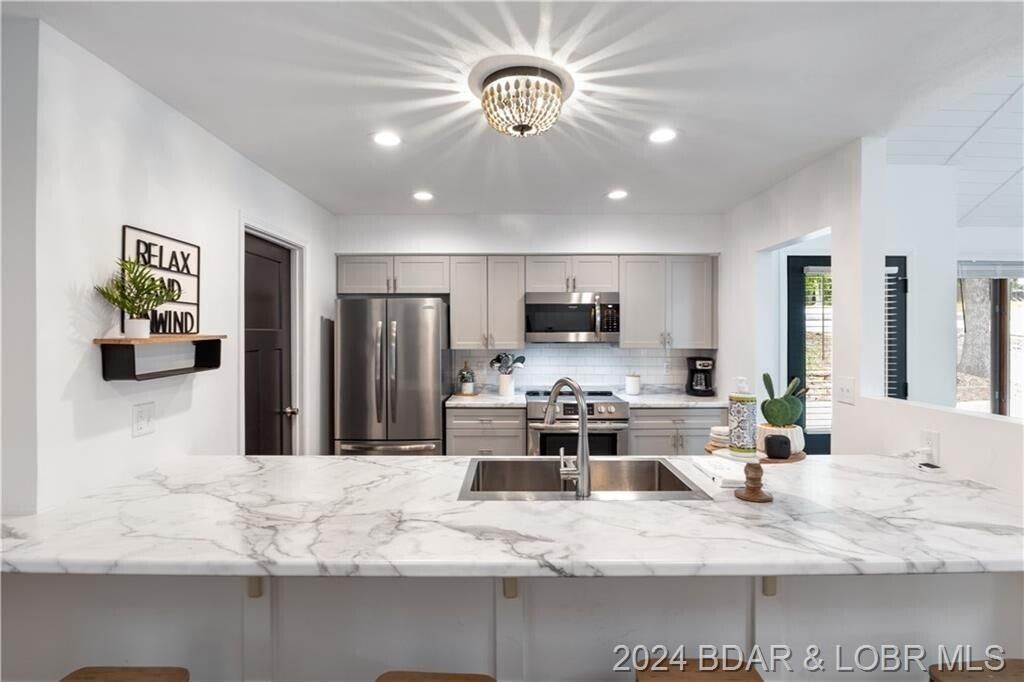 You'll fall in love with this beautifully remodeled, furnished home in highly sought after Four Seasons. Designed to showcase its stunning surroundings, the triple-pane sliding door frames an expanded view, while 3 lakeside bedrooms offer their own water vistas. Charming 3 BD, 2.5 BA home boasts and open floor plan, cozy four seasons room and a 2-car garage, all set on a gentle-sloping, cove-protected lot. The vaulted shiplap ceiling in the living/dining areas is enhanced by skylights and a striking black shiplap gas fireplace wall adds a striking focal point. The home features newer flooring, custom soft-close cabinetry, and sleek black 3-panel doors. Each bathroom is updated with newer vanity and the four-seasons room includes custom shades for year-round comfort. Enjoy outdoor living on the spacious upper/lower decks with black aluminum railing or head down to the martini deck and the water's edge. Included boat dock and lift are ideal for ski boat, fishing boat, tri-toon or wakeboard boat. Circular driveway offers ample parking. This home blends style, comfort, and lake life in one perfect package. Brand new septic
