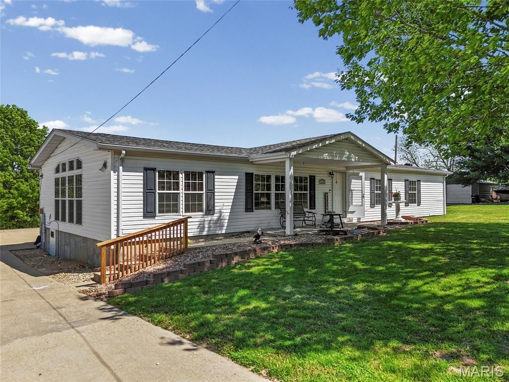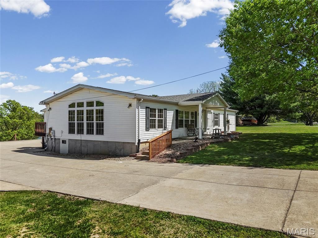 Welcome home to this beautifully maintained 3-bedroom, 2 full bath manufactured home nestled on approximately 1.45 acres in Festus! Step inside to an inviting open floor plan featuring vaulted ceilings, a spacious living room with laminate flooring, and a large additional flex space that can easily serve as a family room, office, or both. The eat-in kitchen offers an island with bar seating, ample cabinetry, and a convenient pantry located in the adjacent laundry room-perfect for everyday functionality. The primary suite is a true retreat with a walk-in closet and a recently remodeled bathroom showcasing a double vanity and oversized walk-in shower. Two additional bedrooms provide comfortable space for family or guests. Enjoy outdoor living at its best with a covered breezeway connecting the home to the oversized attached garage, plus a spacious deck ideal for entertaining or relaxing. The large, level yard offers endless possibilities with no HOA restrictions-bring your ideas, garden, or outdoor hobbies!