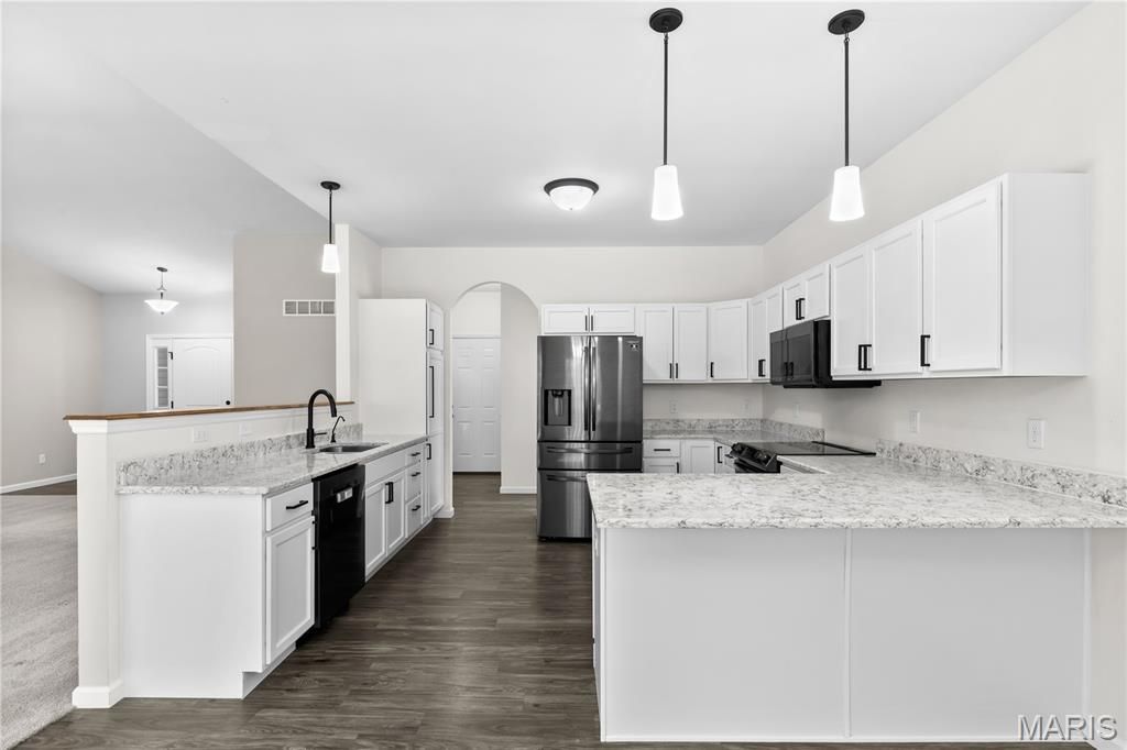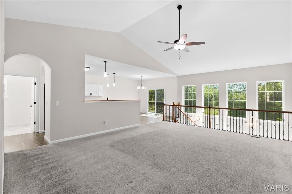 Welcome to this beautifully upgraded 4-bedroom, 2-bath home offering approximately 1,900 sq ft of functional living space. Designed with both comfort and convenience in mind, this home features 9-foot ceilings throughout and an impressive 13-foot vaulted living room that creates a bright, open atmosphere, complemented by elegant archways. The kitchen is a standout with quartz countertops, a built-in cabinet trash system, and reverse osmosis at the sink-perfect for everyday living and entertaining. Just off the kitchen, a sliding glass door brings in natural light and views of the backyard. The spacious primary suite features a striking 10-foot tray ceiling, while both bathrooms are equipped with adult-height counters and upgraded taller shower heads for added comfort. Wide 36-inch interior doors on bedrooms and the laundry room enhance accessibility throughout the home. Enjoy modern efficiency with a smart Ecobee thermostat, whole-home humidifier, water purification and softener systems, plus energy-saving tinted windows in the living room, kitchen, and primary bedroom. The 3-car garage offers exceptional versatility, including a widened and extended bay ideal for larger vehicles or trucks. It is fully insulated and finished with drywall, plus includes nine additional outlets for convenience. The basement features a 9-foot pour, 4th Bedroom, and is already roughed in for a third full bath, giving you plenty of potential for future expansion. The Main floor laundry room is also prepped for a utility sink. Outside, you'll find a fully sodded yard ready to enjoy. With thoughtful upgrades, modern features, and room to grow, this home is truly move-in ready.
