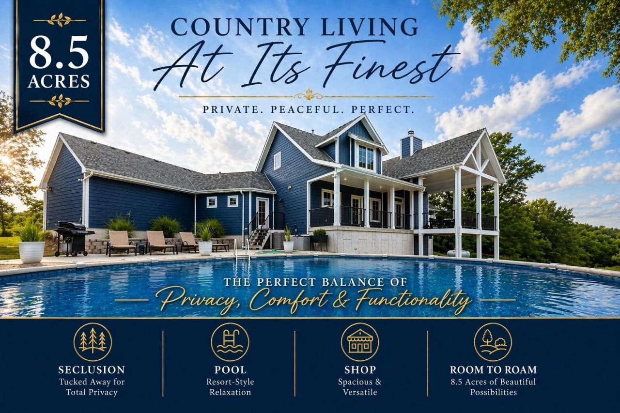 PRICE ENHANCEMENT! Once in a lifetime opportunity to own this Stunning 8.5 Acre ± Modern Farmhouse Estate. This unrestricted, secluded, scenic, and usable land just 1.5 miles from Bull Shoals Lake and 10 minutes to Lake Taneycomo. NO HOA's! This property offers a mix of open pasture, valley views, wet-weather creek, and abundant wildlife. Partially fenced, bring your horses, or a little livestock, great recreation property.The custom-built Modern Farmhouse-style home features 4 beds, 3.5 baths, and premium finishes throughout. Highlights include multi-width ¾'' hickory flooring, reclaimed hand-hewn oak beam accents, vaulted and shiplap ceilings, quartz countertops, and a wood-burning fireplace with blower. Chef's kitchen with custom cabinetry, induction cooktop, and professional-grade appliances. Spacious master suite with custom tile shower, soaker tub, and dual vanities.Additional features:* Public water, private septic, fiberoptic internet* Remote security gate with touchpad* Walk-in pantry & laundry room* Above-ground pool with grilling porch and walkout basement* 2 HVAC systems (one dual fuel w/ propane backup)* 2 concrete storm shelters with steel doors* Wet bar, jack & jill bath upstairs, large basement storage room* 3-car garage with attic storage* Raised garden beds, fruit trees, thornless blackberries* 2 frost-resistant hydrants**36' x 54' shop building includes:*** 2 oversized parking bays* Attached 12'x36' parking pad* Apartment with full kitchen, bathroom, washer/dryer, and mini-split HVAC* Fire-rated sheetrock between apartment and shop* Covered porchJust 25 minutes to Branson. Suitable for horses, cattle, or future development. Shown by appointment only to pre-qualified buyers. All Measurements Are Approx. All information is deemed to be reliable, but Buyer and Buyers Agent please do own Due Diligence on Rules and Regulations and other matters. Listing acerage has been changed from prior offering to n