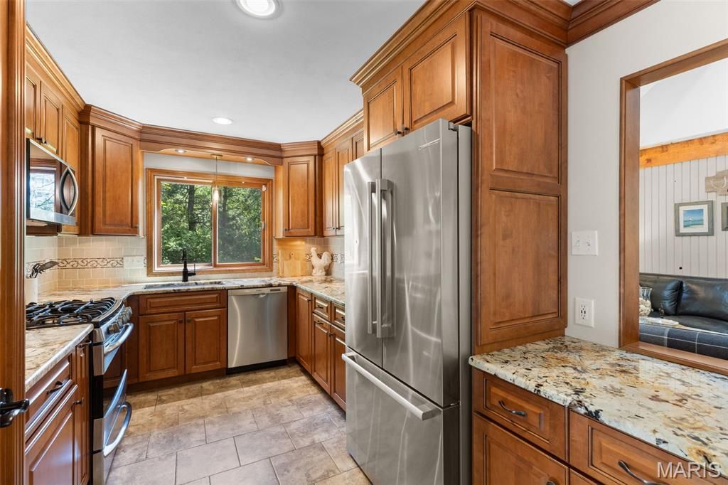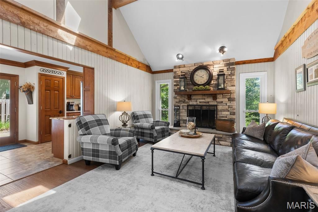 Beautifully updated and move-in-ready, this home offers a charming blend of style and functionality in a central and desirable part of Chesterfield, close to highways and Parkway Schools. Featuring 4 bedrooms and 2.5 baths, the home includes a sought-after main-floor primary suite with convenient main-floor laundry. With nearly 2,000 square feet of inviting living space, plus a professionally finished lower level adding approximately 900 additional square feet, there's plenty of room to relax, entertain, or unwind. The kitchen is thoughtfully designed with custom wood cabinetry, granite countertops, a gas cooktop and oven, ceramic tile flooring, and views of the backyard. The great room features soaring ceilings open to the second floor and a cozy wood-burning stone fireplace, complemented by beadboard detailing along the walls, creating a warm and welcoming gathering space. Upstairs, three generously sized bedrooms feature newer carpet (2022) and are complemented by a versatile bonus loft-ideal for a reading nook, homework station, or home office. Major updates include a new roof (2025), offering added value and long-term peace of mind. Step outside to enjoy a private backyard backing to a wooded area, creating a peaceful setting, complete with a patio and firepit-perfect for relaxing or entertaining. This home offers flexible living space and everyday comfort in a great Chesterfield location.