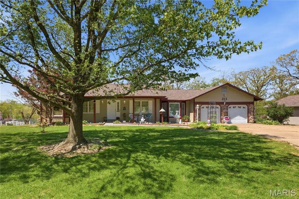 If you're seeking privacy, space, and a spectacular setting, you'll love 213 Lincoln Ln in the quiet town of Winfield, Missouri. This beautiful three-bedroom, two-bathroom home sits on an expansive 3-acre lakefront lot, offering rare access to a large neighborhood lake where you can enjoy peaceful views, fishing, or simply unwinding at the water's edge. The exterior features a spacious two-car garage, an additional detached garage ideal for hobbies or storage, and a generous fenced backyard. Whether you're sipping coffee by the shoreline or hosting friends outdoors, this property delivers a retreat-like experience. Enjoy your private above ground pool during the summer months just off your large deck that has gorgeous view of the lake! Step inside to a warm and welcoming family room with lofted ceilings, a striking wood-burning fireplace, and a walkout to the impressive three-seasons room. This sun-filled space is surrounded by an expansive deck, creating a perfect flow for weekend gatherings or quiet evenings overlooking your property. The large kitchen is sure to please any home chef and boasts custom cabinetry, granite countertops, a stylish backsplash, and a bright breakfast room with a lake view. The main floor also offers two comfortable guest bedrooms and a lovely primary suite featuring a dual-vanity bathroom and a beautiful walk-in shower. A partially finished walkout basement adds even more versatility, providing a great entertaining area with ample room for future expansion.
