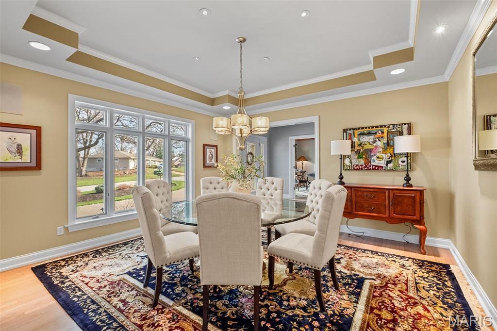 28 Ladue Meadows is a custom built1.5 story home offering versatility among quality finishes on a private 1.2 acre lot nestled in the heart of Creve Coeur! The floor plan brings in a main floor primary suite with a spa like primary bath and expansive walk-in closet which includes built-ins. Top of the line finishes in the kitchen include Sub Zero refrigerator, Thermador gas cooktop, Thermador double ovens, Woodmode cabinets, stunning granite countertops and a Bosch dishwasher. The kitchen center island and breakfast room space lead you into the inviting hearth room offering custom built-ins, exposed wood beams, a stone fireplace creating an irresistible spot to gather! Extend into the dining room with a butler style pantry area, or enjoy the main level family room area which offers a wet bar and gorgeous and private rear view! Features that optimize this home also include an oversized 3 car garage complete with electric charging ports and new steel backed insulated doors, the main floor utility room with a separate exterior entrance and TWO staircases connecting spaces and amplifying the customized versatility of this floor plan! The main level office connects to a full hall bath and is considered in the bedroom count. The above grade sq ftg is 5126 and combined sq ftg with finished lower level spaces brings you to 7026 square feet. The 3 secondary bedrooms on the 2nd floor are nicely sized with one of those being an en suite and a Jack and Jill servicing the other two bedrooms. The loft area outside the bedrooms provides a nice gathering spot/nook on the 2nd floor! Move through to the lower level and find a designated work out room, a theater room/space, wet bar, craft/bonus room with plenty of storage space! The quality remains evident in features such as refinished grey washed quarter sawn oak hardwood floors, steam shower and separate soaking tub in the primary bath, newer aggregate driveway, professional landscaping, a touch pad stereo system, maintenance free deck off the hearth room area, and a heated saltwater inground pool! Convenient commutes and Parkway North schools add to the list of features this amazing opportunity offers!