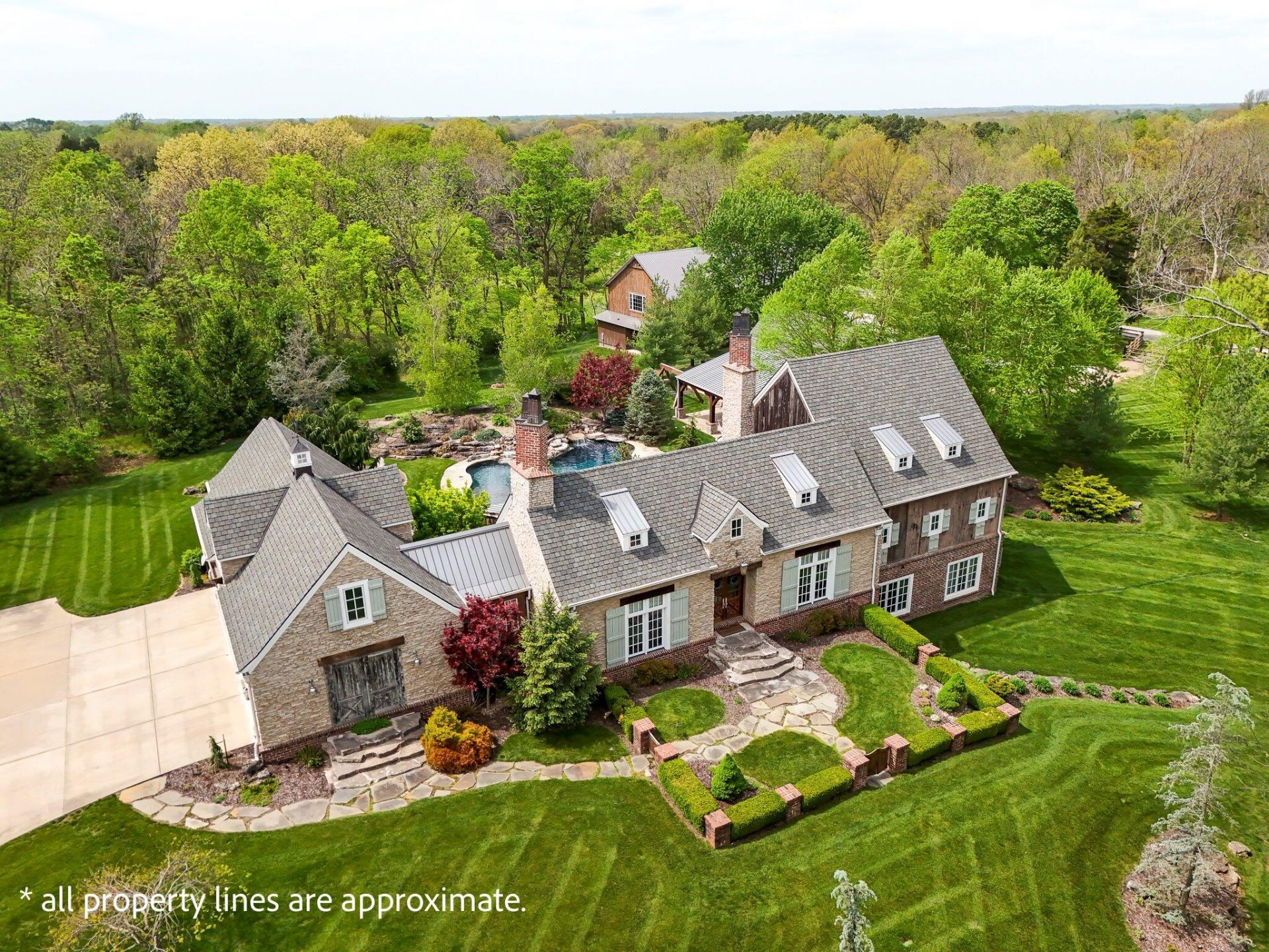 Custom-crafted with timeless materials, this exceptional estate sits on just under 5 acres in Royal Crest in Rogersville, just minutes from southeast Springfield.The great room impresses with soaring ceilings, exposed beams, a floor-to-ceiling wood-burning fireplace, and wood flooring throughout.The kitchen blends function and style with Alpine cabinetry, Thermador appliances, warming drawer, butler's pantry with ice maker, and a large island with bar seating, flowing into the dining space.The main-level primary suite offers a private retreat with gas fireplace, custom wood ceiling, sitting area, and access to the covered patio. The spa-like bath features a soaking tub, dual vanities, heated floors, towel warmer, steam shower, and custom Alpine closets.Upstairs includes a lofted office overlooking the great room and Jack-and-Jill bedrooms. A private suite above the garage serves as in-law quarters with full kitchen, laundry, and separate systems.The walk-out basement includes a media room, gym, additional living space, and game area with Restoration Hardware bar.Outdoors, enjoy a resort-style setting with a saltwater lagoon pool, waterfalls, deck jets, fire pit, and outdoor kitchen with ProFire grill. A newly built indoor pickleball court with rec space, kitchen, and full bath is complemented by an outdoor court with LED lighting and basketball goal.Gated entry leads to a detached barn/garage with reclaimed barnwood interior and two bays. Additional features include custom doors, Jeld-Wen windows, irrigation, water softener, air purification, and geothermal HVAC.