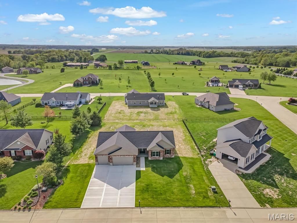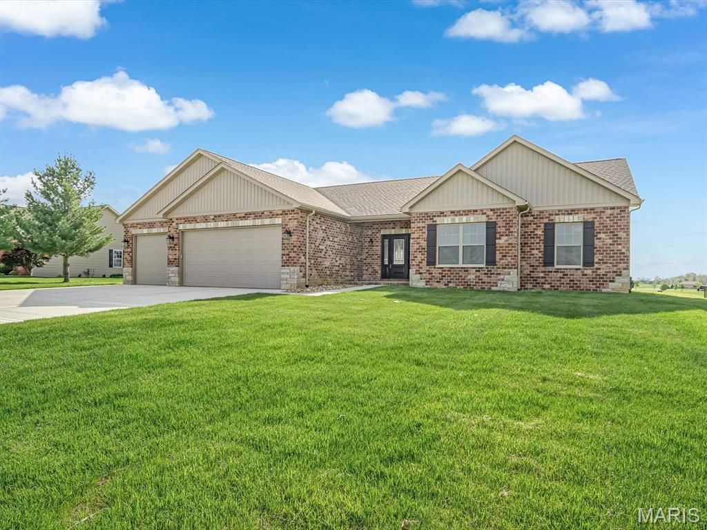 Start off the New Year with this Stunning New Construction in Wildwood West Estates. Welcome to your forever home in the prestigious Wildwood West Estates of Smithton, IL - a peaceful, upscale neighborhood where nature flourishes and majestic eagles soar. Situated on a generous 0.51 acre lot, this newly constructed residence offers 2069 sq ft of refined living space and timeless curb appeal with a stately brick front enhanced by artfully placed stone accents. Step through the covered porch and onto a light-filled great room that flows seamlessly into the dining area and gourmet kitchen. A wall of windows frames the serene backyard views and glorious sunsets, while a cozy fireplace flanked by custom display shelves and a coffered ceiling adds warmth and architectural charm. The kitchen is a showpiece, featuring white cabinetry with gold hardware, quartz countertops, a deep gray island, and stainless steel Whirlpool appliances - including an electric range/oven, microwave, dishwasher, and refrigerator. A walk-in pantry and ample lighting completes this space. Just off the kitchen, a spacious flex room with an attached half bath offers the perfect setup for a home office or guest bedroom. The laundry room includes a utility sink and washer/dryer hookups. Across from the laundry room is the perfect space for a custom drop zone - ideal for organizing coats, bags, and shoes as you enter from the garage. The private primary suite is a true retreat, boasting a generous bedroom, double sink vanity, large walk in shower and walk-in closet. Two additional spacious bedrooms and a full bath complete the sleeping quarters. Downstairs a large unfinished basement provides endless possibilities for future expansion, hobbies, or storage. Outside enjoy a covered concrete porch with recessed lighting, ceiling fan, and brick trim - perfect for relaxing or entertaining and watching the breathtaking sunsets in this country setting. The finished three-car garage includes multiple outlets and a dedicated receptacle for electric vehicle charging. Every detail has been thoughtfully designed -- this is a home you'll be proud to own for years to come. Notice: Many of the photos in this presentation have been virtually staged for idea purposes only. There is no furniture in the home presently.