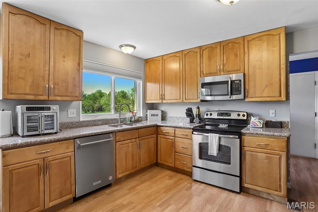 5 bedrooms fenced half-acre lot walk-out lower level. Two-story home in sough after Parkway West with 2,730 sq ft above grade, 5 bedrooms, 2.5 baths, and a 2-car attached garage. Main level includes an entry foyer, living room, dining room, family room with gas fireplace, eat-in kitchen, and main-floor laundry. Kitchen features 42 custom maple cabinetry, granite countertops, pantry, and stainless steel appliances. Upper level includes a large primary suite with walk-in closet and private bath plus four additional bedrooms and a second full bath. Walk-out lower level offers storage and future finish potential. Exterior features include a fully fenced 0.49-acre lot, stunning backyard overlooking the common area pond and fountain. Located ~1.8 miles from Costco, ~1.8 miles from Walmart, ~0.2 miles from Hwy 144 access, and I-64 access approximately 4 miles away. Professional photos, 3D tour, and floor plan planned for marketing coming on Tuesday April 21, 2026.