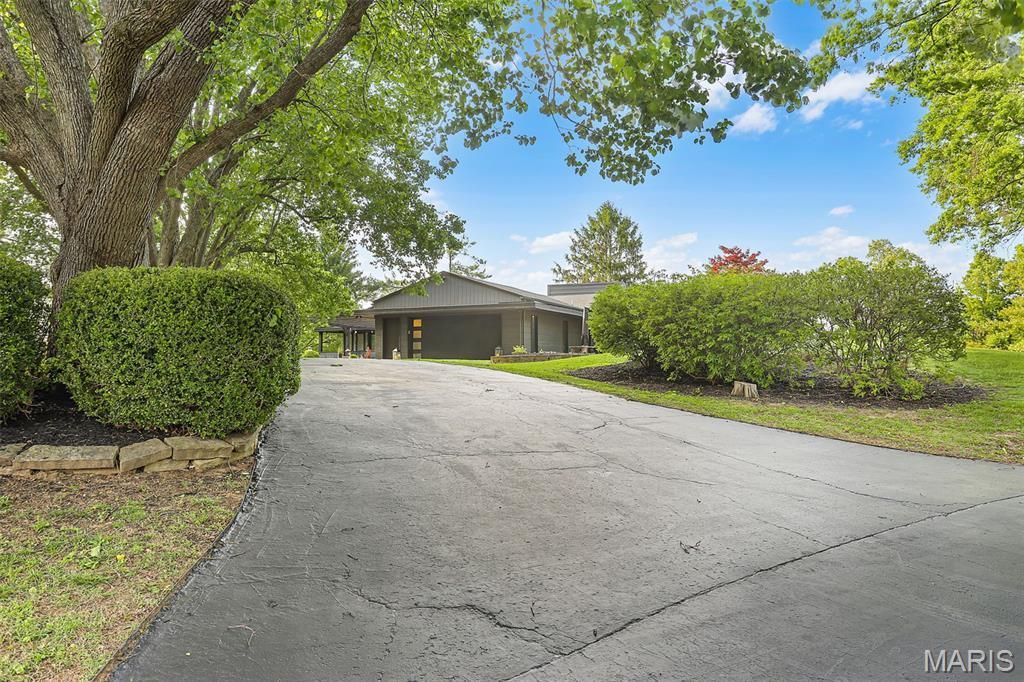 This stunning 1964 Frank Lloyd Wright-inspired mid-century modern home is tucked away in a private enclave in Old Jamestown, offering a rare blend of architectural character and natural serenity. Set on a beautifully tree-lined 1-acre lot and surrounded by additional acres of manicured common ground, the property delivers a true sense of retreat. Designed for both comfort and entertaining, the home features expansive open living spaces with exposed beams, plank ceilings, and two spacious living rooms. The oversized two-car garage and generous parking area add convenience, while three patios and a large deck with a built-in hot tub create seamless indoor-outdoor living. The chef's kitchen is a standout, complete with double ovens and ample workspace. The impressive primary suite offers abundant space, while guests will enjoy a private suite featuring a striking stone fireplace and an oversized walk-in closet. At the heart of the home, a dramatic stone chimney anchors the Great Room, enhanced by a Buck-stove fireplace insert-perfect for cozy evenings. As an added bonus, residents enjoy access to an exclusive private saltwater pool and clubhouse, just a short walk away.