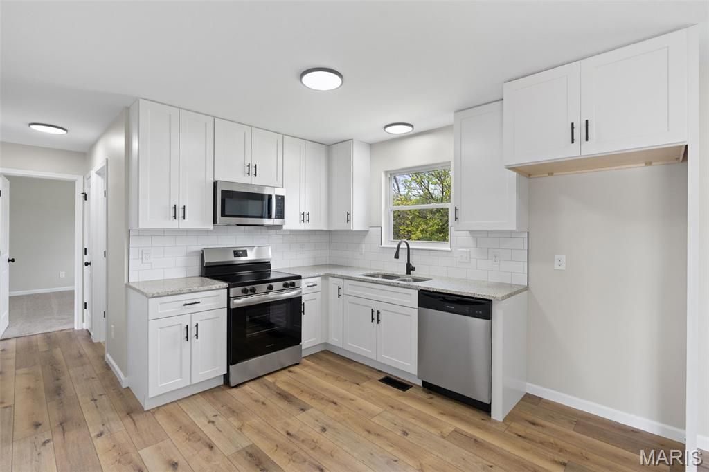 Completely remodeled and move-in ready with space for everyone. This beautifully updated 4-bedroom, 2 full bath home offers a perfect blend of modern design and functional living space. The stunning new kitchen features granite countertops, 42 shaker-style cabinetry, stainless appliances and a custom subway tile backsplash-designed for both style and everyday use.Both full bathrooms have been fully renovated with sleek, contemporary finishes. The main level offers comfortable living space, while the finished walkout lower level expands your options with a spacious second living area, 4th bedroom, two additional sleeping areas or flex rooms, and a separate finished laundry room-ideal for multigenerational living, guests, or work-from-home needs. Step outside to enjoy the fenced backyard that backs to a park. A massive 2-car garage provides ample space for vehicles, storage, or hobbies.This one checks all the boxes-updated, spacious, and perfectly located close to schools, shopping and amenities.